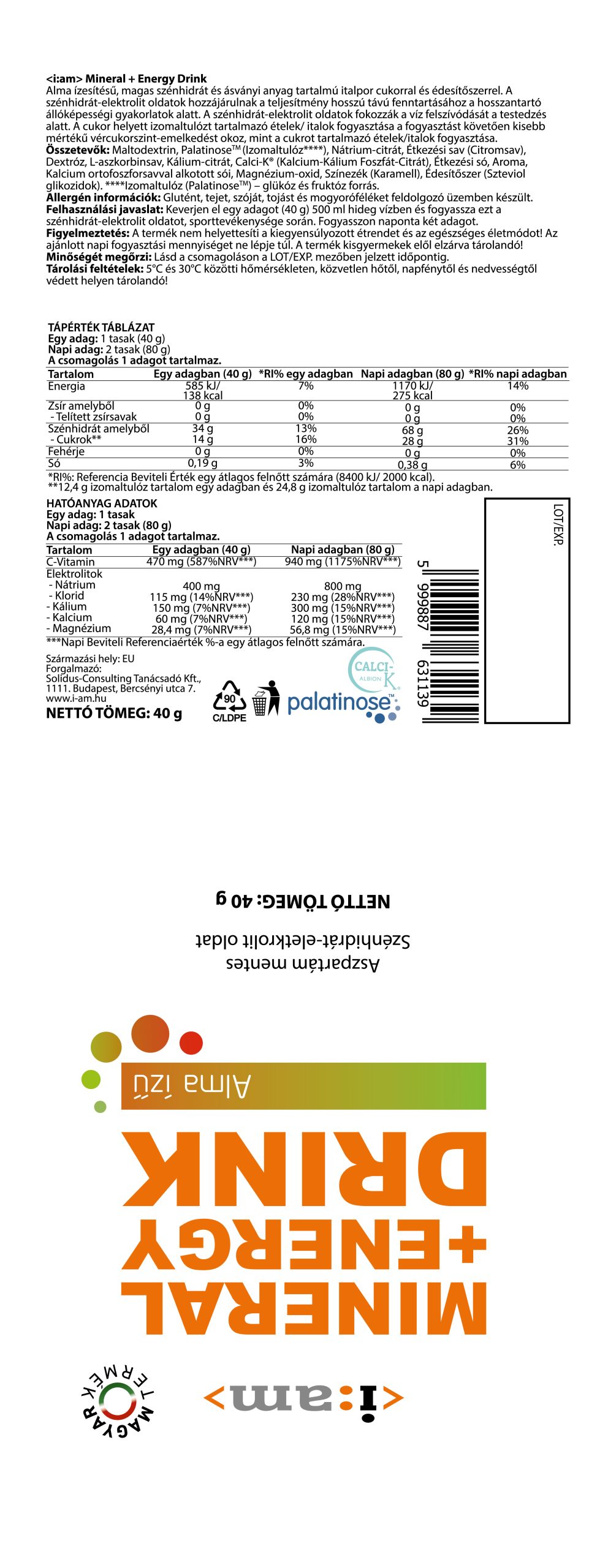 „mineral + energy” sportital-porunkból az ajánlásunknak (40g+500ml víz) megfelelően kevert frissítő, amellett, hogy magas az energia tartalma és az izzadás által elveszített ionokat is megfelelő arányban és mennyiségben pótolja, alacsony sűrűségű, hipotóniás ital, amely fenntartja a szervezetben az ionegyensúlyt és hatékonyan biztosítja az izomok folyamatos energiaellátását. A jövő a folyadék alapú frissítésé, ehhez nyújt megfelelő támogatást a mineral+energy italporunk.